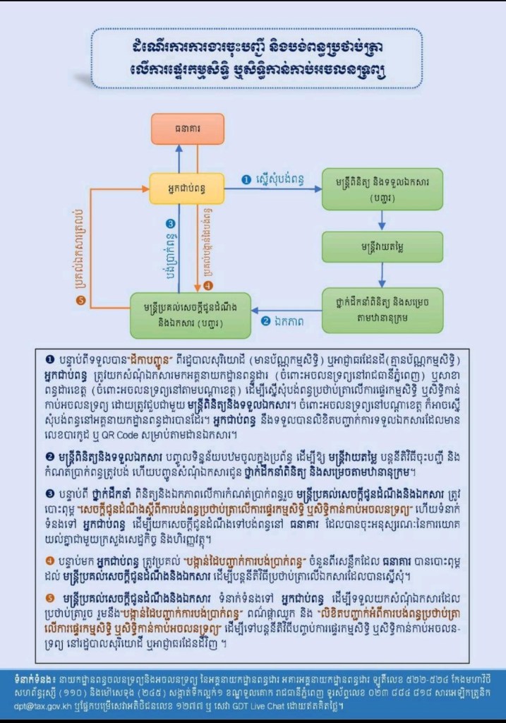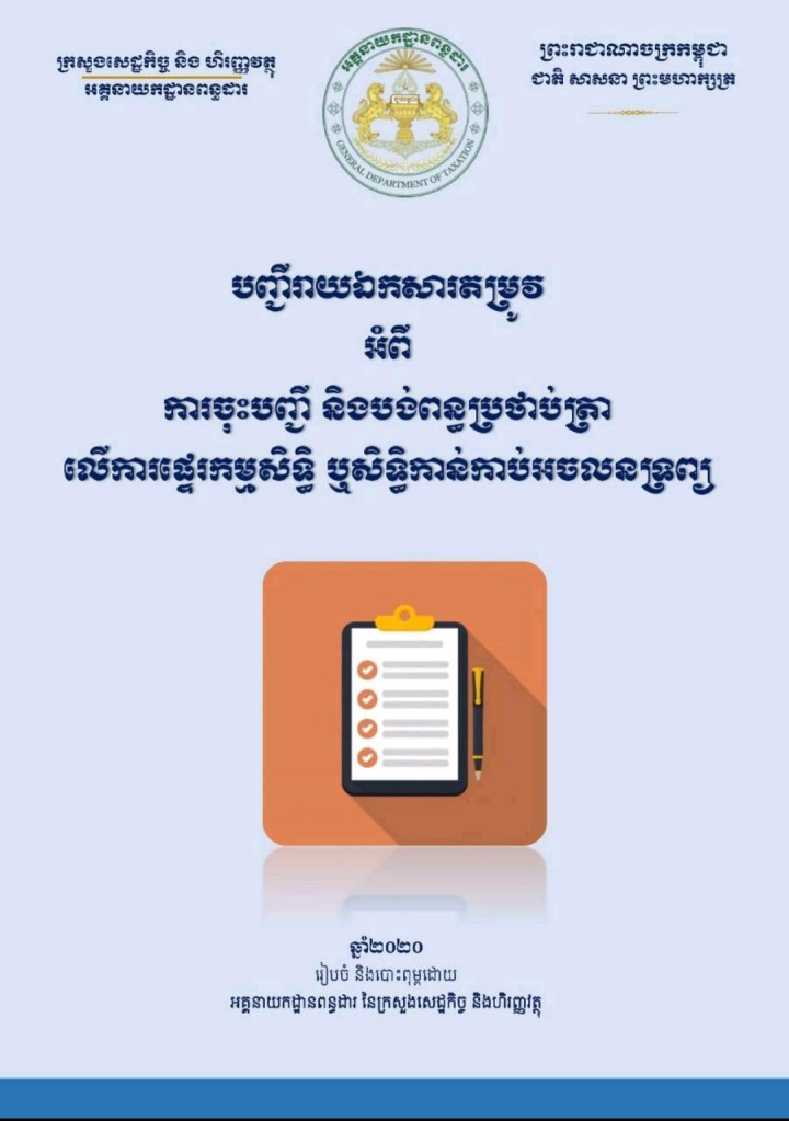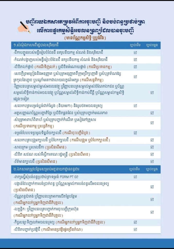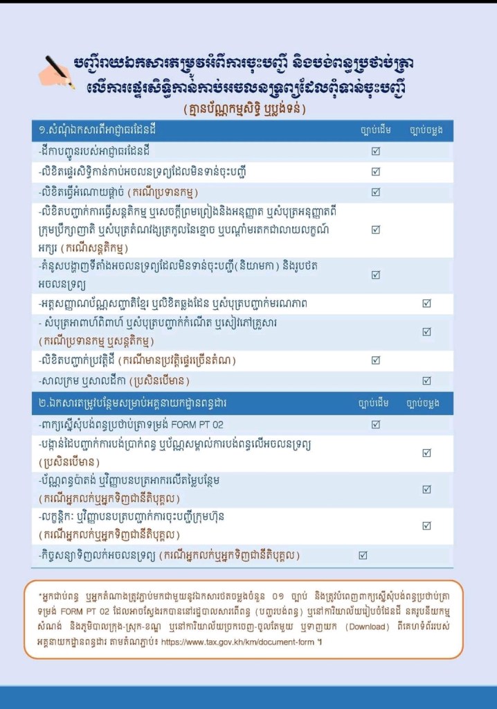 បញ្ជីឯកសារតម្រូវ អំពីការចុះបញ្ជី និងបង់ពន្ធប្រថាប់ត្រាលើការផ្ទេរកម្មសិទ្ធិ ឬសិទ្ធិកាន់កាប់អចលនទ្រព្យ