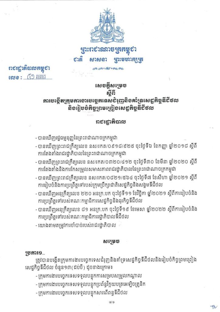 សេចក្ដីសម្រេចស្ដីពីការបង្កើតក្រុមការងារបច្ចេកទសជំរុញនិងគាំទ្រសេដ្ឋកិច្ចឌីជីថល និងរៀបចំកិច្ចព្រមព្រៀងសេដ្ឋកិច្ចឌីជីថល