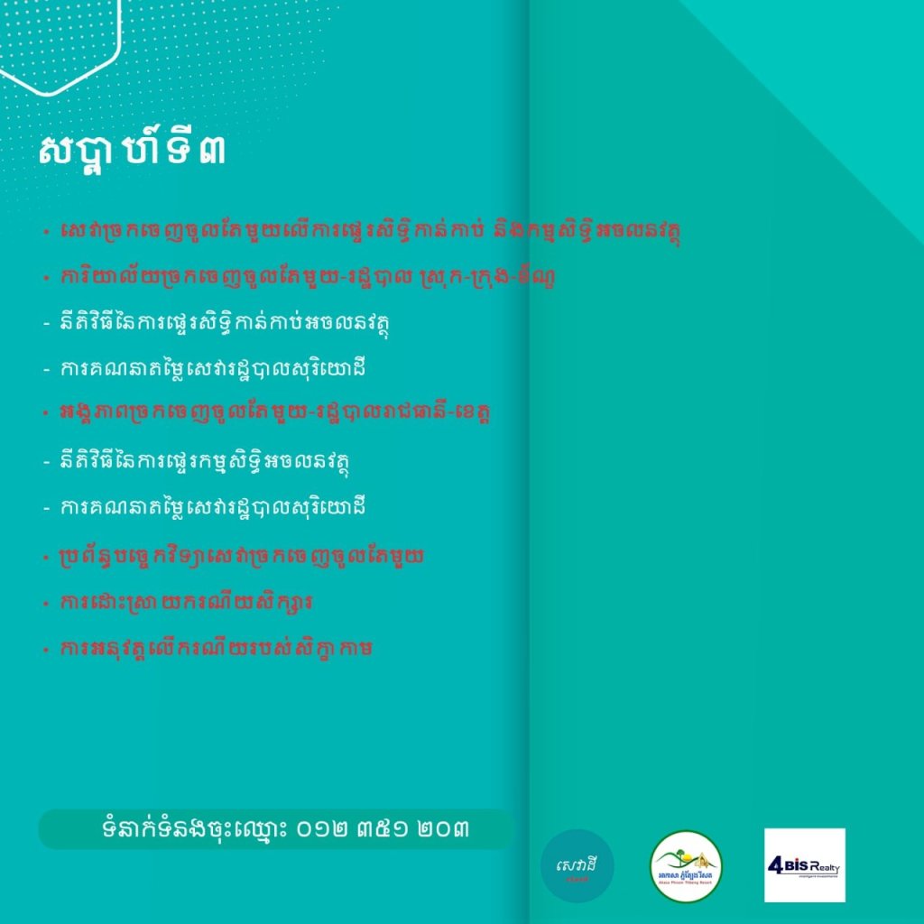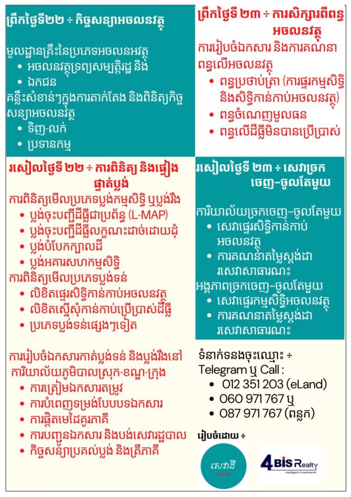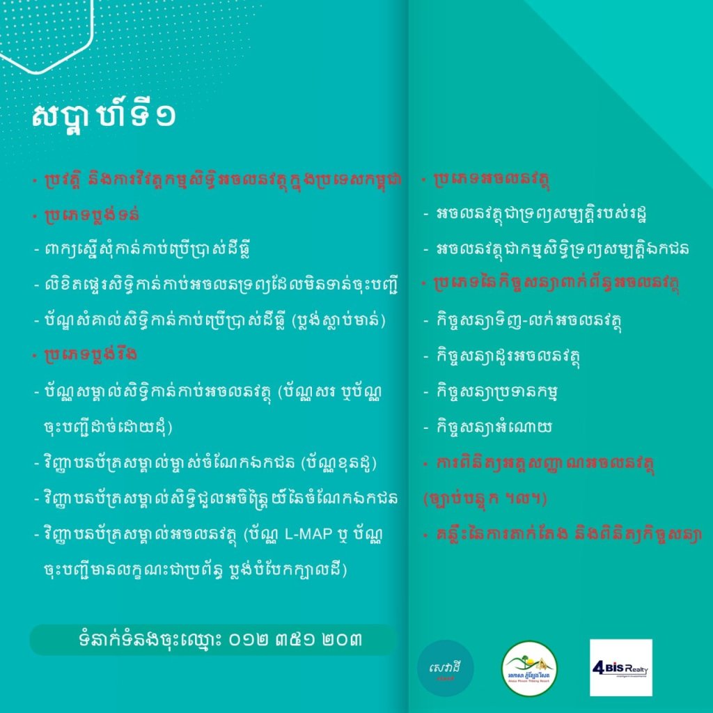 សង្ខេបសកម្មភាពនៃសិក្ខាសាលាទាំង៣លើក ក្រោមប្រធានបទស្ដិពី “នីតិវិធីនៃការផ្ទេរកម្មសិទ្ធិ និងសិទ្ធិកាន់កាប់លើអចលនវត្ថុ” ។