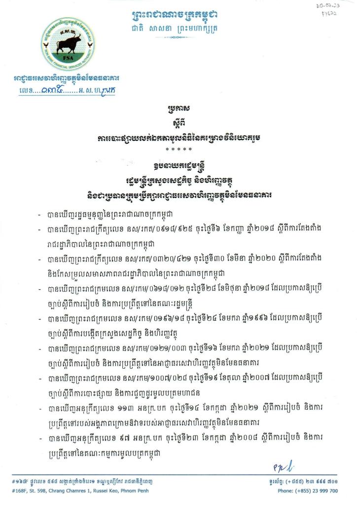 ប្រកាសស្ដីពីការបោះផ្សាយលក់ឯកតាមូលនិធិនៃគម្រោងវិនិយោគរួម ។