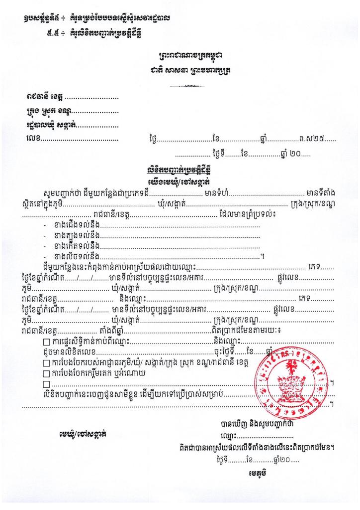 - លិខិតបញ្ជាក់ភាពនៅលីវ (ពោះម៉ាយ មេម៉ាយ)លិខិតបញ្ជាក់ទីលំនៅ