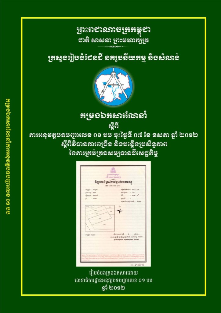 កម្រងឯកសារណែនាំស្តីពីការអនុវត្តបទបញ្ជាលេខ ០១ បប ចុះថ្ងៃទី០៧ ខែឧសភា ឆ្នាំ២០១២ ស្តីពីវិធានការពង្រឹង និងបង្កើតប្រសិទ្ធភាពនៃការគ្រប់គ្រងសម្បទានដីសេដ្ឋកិច្ច។