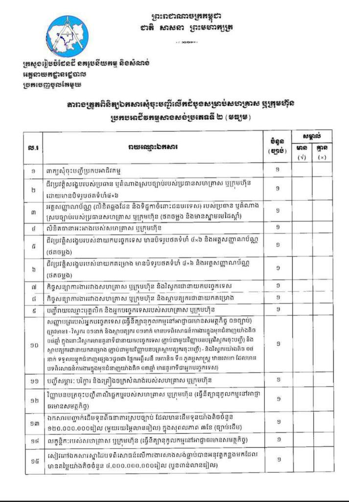 ឯកសារស្នើសុំសេវា ចុះបញ្ជីលើកដំបូងសម្រាប់សហគ្រាសឬក្រុមហ៊ុនប្រកបអាជីវកម្មសាងសង់ប្រភេទ២ (មធ្យម)ដើម្បីស្នើសុំចុះបញ្ជីលើកដំបូងសម្រាប់សហគ្រាសឬក្រុមហ៊ុនប្រកបអាជីវកម្មសាងសង់ប្រភេទ២ (មធ្យម) ម្ចាស់សំណើត្រូវបំពេញបែបបទ និងភ្ជាប់ឯកសារតម្រូវ រួចយកមកដាក់ស្នើសុំនៅការិយាល័យច្រក ចេញ-ចូល នៅក្រសួងរៀបចំដែនដី នគរូបនីយកម្ម និងសំណង់ នៅរៀងរាល់ម៉ោងធ្វើការ។
