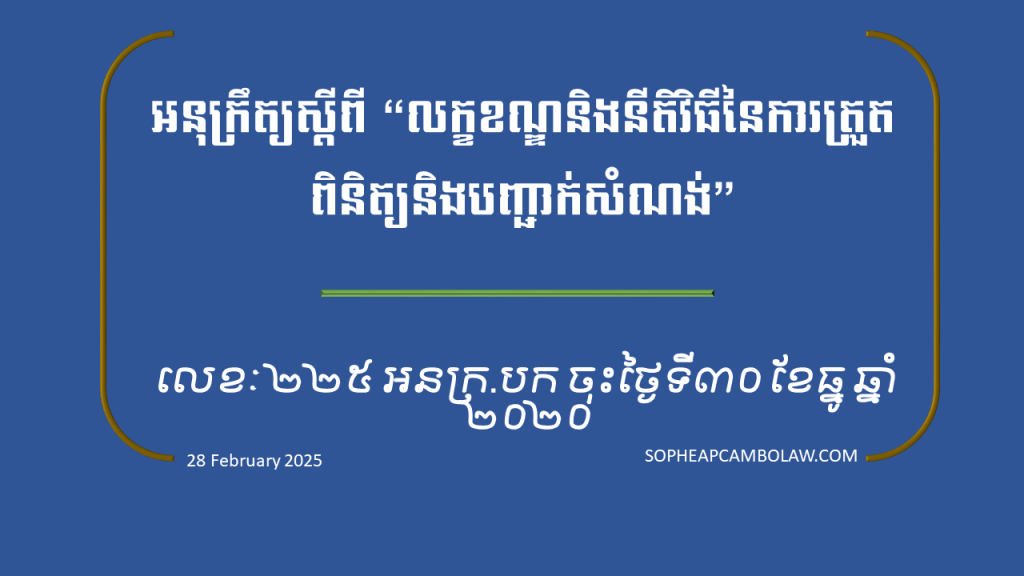 អនុក្រឹត្យលេខៈ ២២៥ អនក្រ.បក ស្ដីពី “លក្ខខណ្ឌនិងនីតិវិធីនៃការត្រួតពិនិត្យនិងបញ្ជាក់សំណង់” ចុះថ្ងៃទី៣០ ខែធ្នូ ឆ្នាំ២០២០ ។