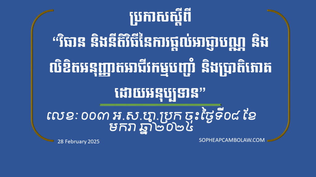 ប្រកាសលេខៈ ០០៣ អ.ស.ហ.ប្រកស្ដីពី “វិធាន និងនីតិវិធីនៃការផ្ដល់អាជ្ញាបណ្ណ និងលិខិតអនុញ្ញាតអាជីវកម្មបញ្ចាំ និងប្រាតិភោគដោយអនុប្បទាន” ចុះថ្ងៃទី០៨ ខែមករា ឆ្នាំ ២០២៤។