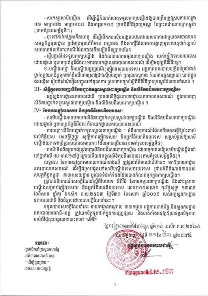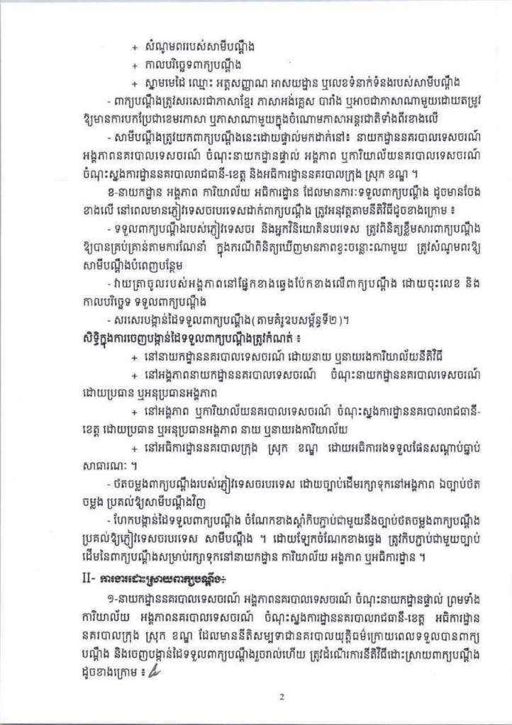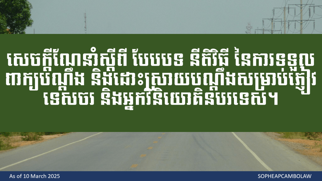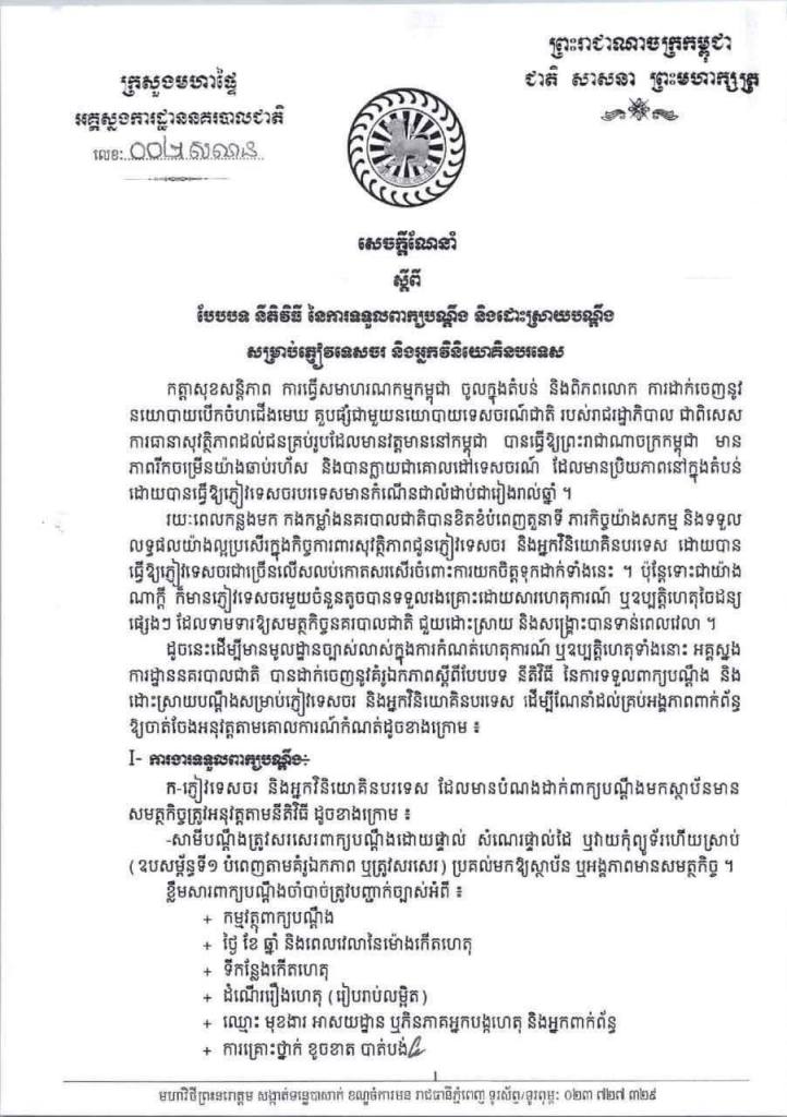 សេចក្ដីណែនាំស្ដីពី បែបបទ នីតិវិធី នៃការទទួលពាក្យបណ្ដឹង និងដោះស្រាយបណ្ដឹងសម្រាប់ភ្ញៀវទេសចរ និងអ្នកវិនិយោគិនបរទេស។