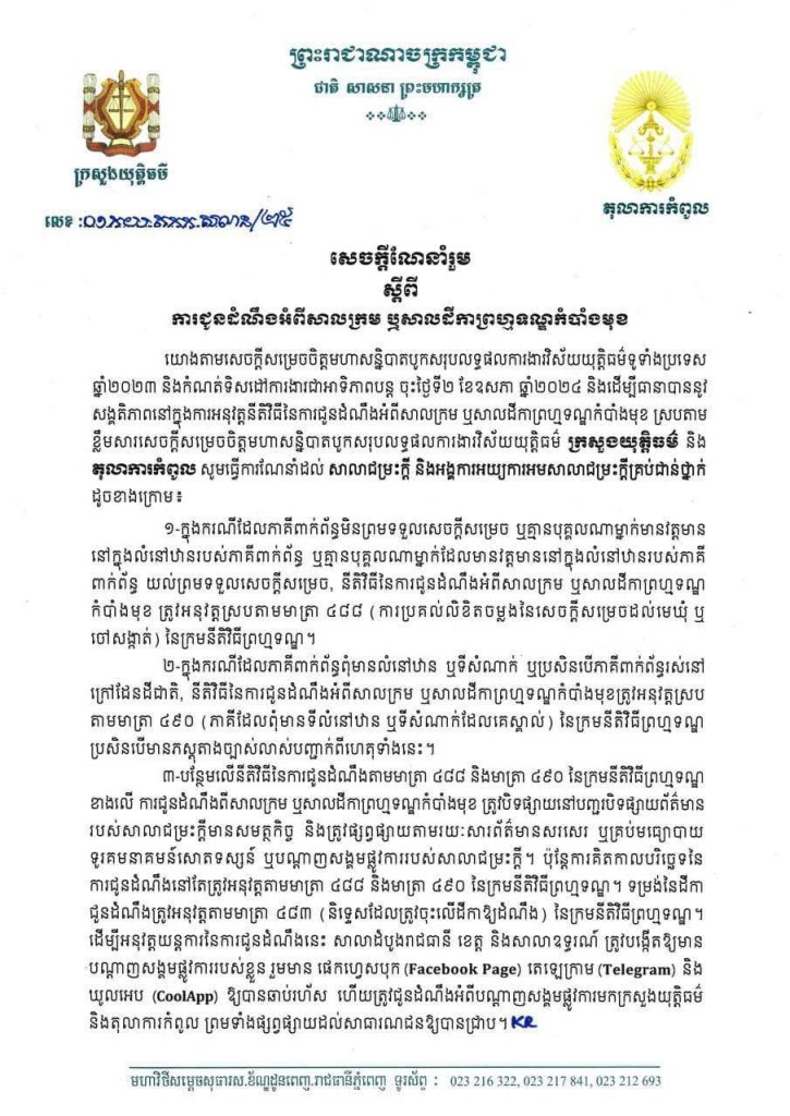 សេចក្ដីណែនាំរួមស្ដីពីរ “ការជូនដំណឹងអំពីសាលក្រម ឬសាលដីកាព្រហ្មទណ្ឌកំបាំងមុខ”។