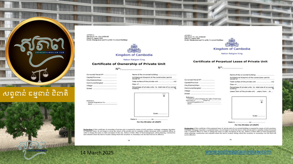 - Legal Basis: Typically based on Cambodia’s Law on Co-Owned Buildings.