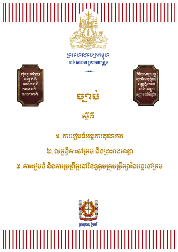ច្បាប់គោលទាំងបីនៅក្នុងវិស័យតុលាការ រួមមាន៖ ច្បាប់ស្ដិពីការរៀបចំអង្គការតុលាការ, ច្បាប់ស្ដីពីលក្ខខន្តិកៈចៅក្រម និងព្រះរាជអាជ្ញា និងច្បាប់ស្ដីពីការរៀបចំ និងការប្រព្រឹត្តទៅនៃឧត្ដមក្រុមប្រឹក្សានៃអង្គចៅក្រម។