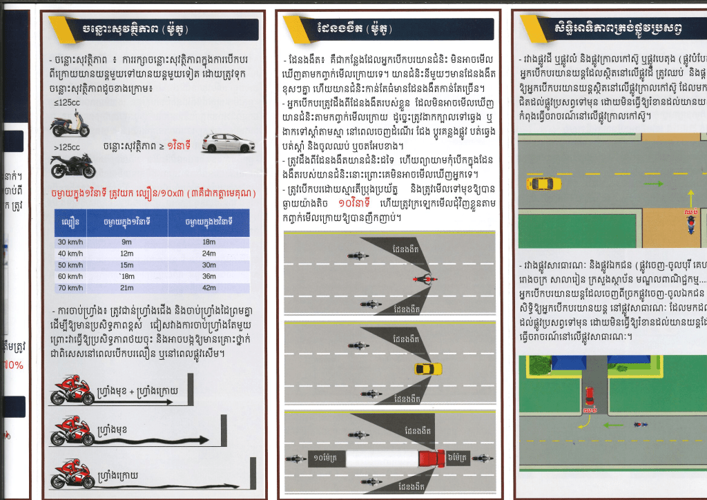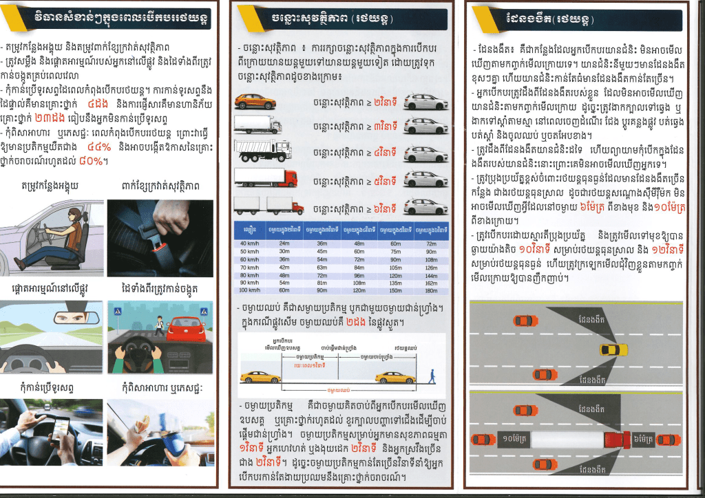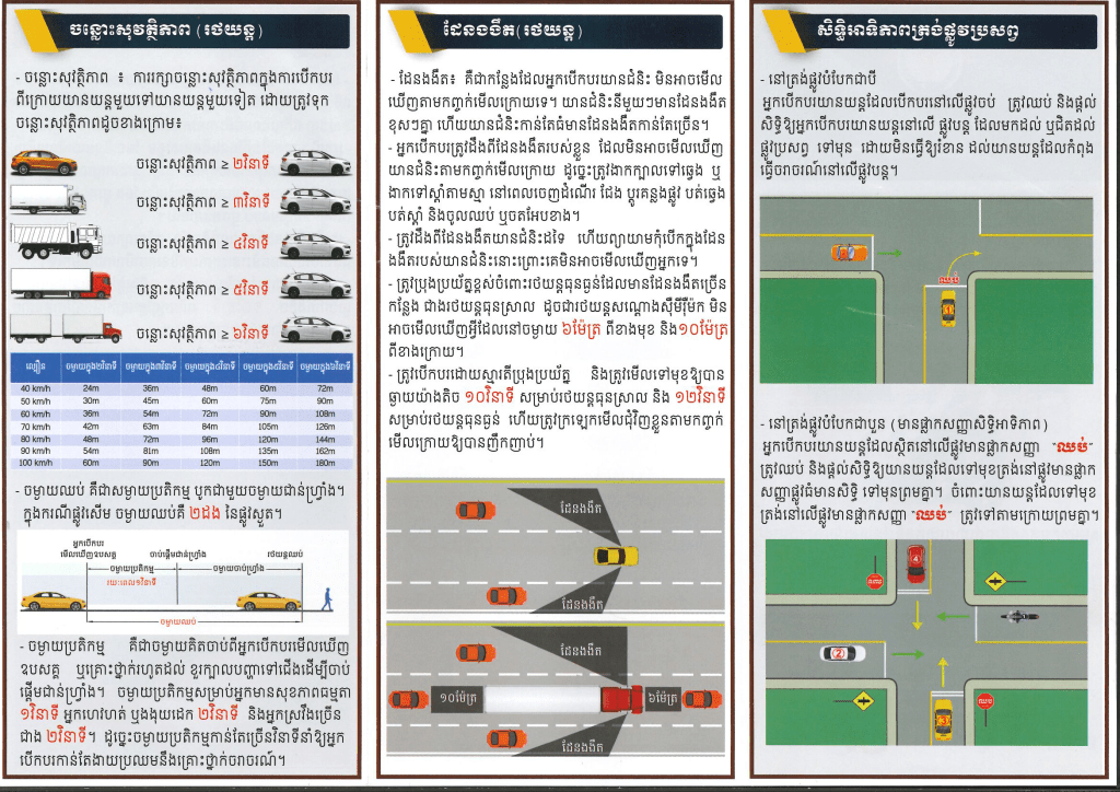 - ចន្លោះសុវត្ថិភាព៖ ការរក្សាចន្លោះសុវត្ថិភាពក្នុងការបើកបរ ពីក្រោយយានយន្តមួយទៅយានយន្តមួយទៀត ដោយត្រូវទុក ចន្លោះសុវត្ថិភាពដូចមានភ្ជាប់ជូនក្នុងខិតប័ណ្ណខាងក្រោម៖
