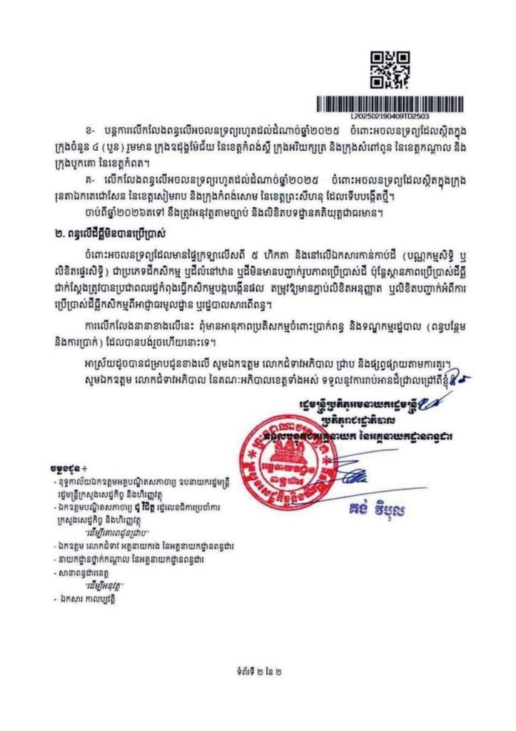 រាជរដ្ឋាភិបាលសម្រេចបន្តលើកលែងពន្ធលើអចលនទ្រព្យចំពោះសង្កាត់និងក្រុងមួយចំនួន និងការបន្ធូរបន្ថយលក្ខខណ្ឌ លើកលែងពន្ធលើដីធ្លីមិនបានប្រើប្រាស់ ចំពោះអចលនទ្រព្យមានផ្ទៃក្រឡាលើសពី ៥ ហិកតា ដែល ប្រជាពលរដ្ឋកំពុងធ្វើកសិកម្មបង្កបង្កើនផល។