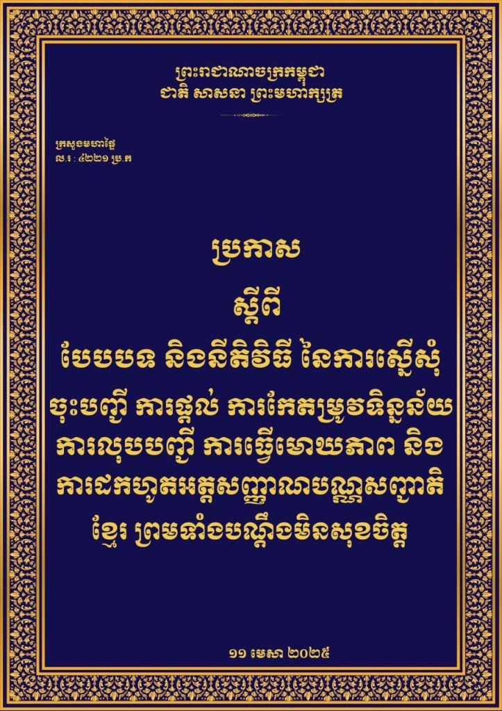 រកាសលេខ៤២២១ប្រ.កបែបបទនិងនីតិវិធីនៃការស្នើសុំចុះបញ្ជីការផ្តល់ការកែតម្រូវទិន្នន័យការលុបបញ្ជីការធ្វើមោឃភាពនិងការដកហូតអត្តសញ្ញាណបណ្ណសញ្ជាតិខ្មែរព្រមទាំងបណ្តឹងមិនសុខចិត្ត។