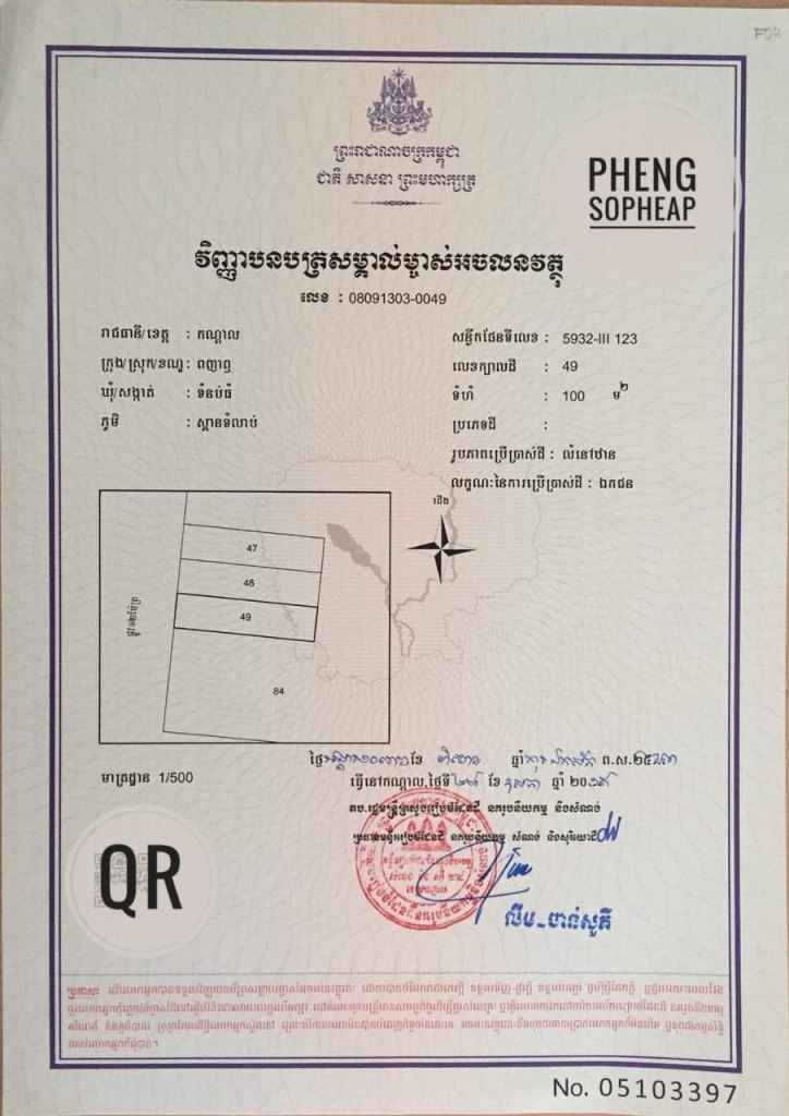 Land Location: Spean Tomlob Village, Tumnob Thom Commune, Ponhea Leu District, Kandal Province.