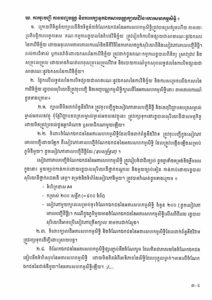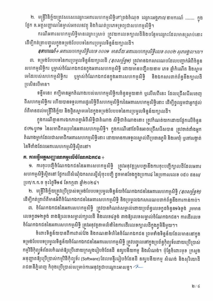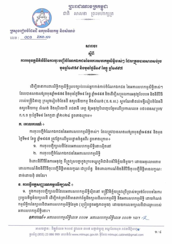 សារចលេខ០០១ ដនស.សរ ស្ដីពការអនុវត្តនីតិវិធីនៃការចុះបញ្ជីចំណែកឯកជននៃអគារសហកម្មសិទ្ធិចាស់ៗ ដែលត្រូវបានសាងសង់រួច មុនឆ្នាំ១៩៧៩ និងមុនថ្ងៃទី១៩ ខែធ្នូ ឆ្នាំ១៩៩៧។