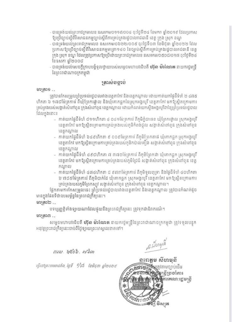 បានកែសម្រួលព្រំប្រទល់រដ្ឋបាលរវាងខេត្តតាកែវ និងខេត្តកណ្តាល ដោយ កាត់យកផ្ទៃដីទំហំ ២ ៤៧៥ ហិកតា ៦ ១៧៨ម៉ែត្រការ៉េ ពីឃុំព្រែកផ្ទាល និងឃុំគោកធ្លកនៃស្រុកអង្គរបូរី ខេត្តតាកែវ មកឱ្យស្ថិតក្រោមការ គ្រប់គ្រងរបស់សង្កាត់សំពៅពូន ក្រុងសំពៅពូន ខេត្តកណ្តាល ដោយកំណត់យកស្ទឹងអង្គរបូរីជាខ្សែព្រំប្រទល់រដ្ឋបាលដែលក្នុងនោះ៖