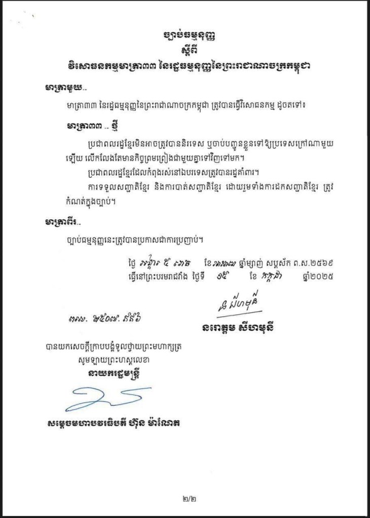 ព្រះរាជក្រម ប្រកាសឱ្យប្រើ ច្បាប់ធម្មនុញ្ញស្តីពីវិសោធនកម្មមាត្រា៣៣ នៃរដ្ឋធម្មនុញ្ញនៃព្រះរាជាណាចក្រកម្ពុជា។
