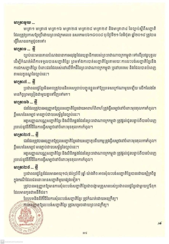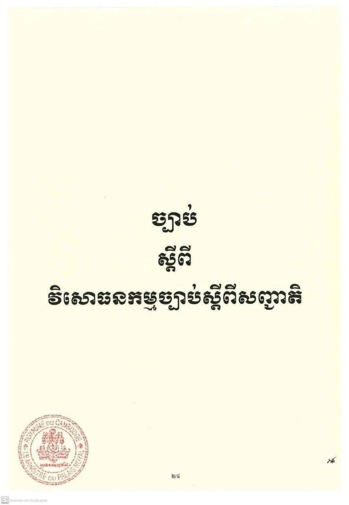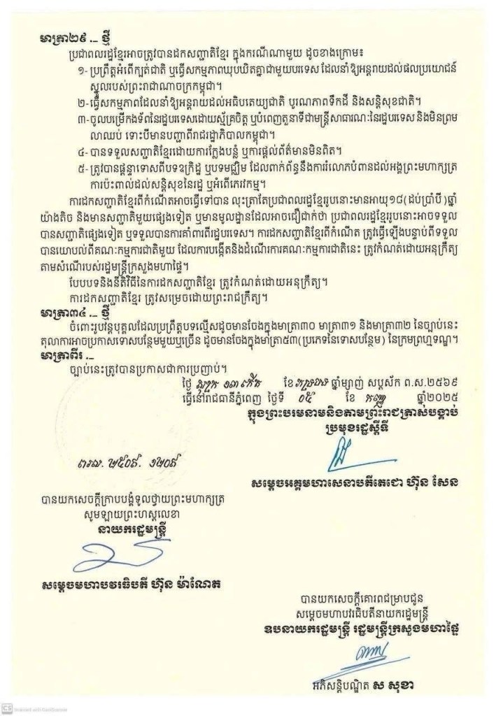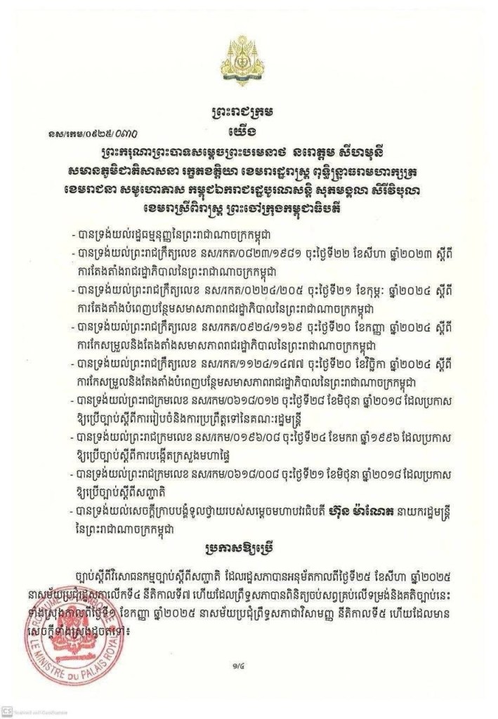 ព្រះរាជក្រម នស/រកម/០៩២៥/០៣០ ចុះថ្ងៃទី៥ ខែកញ្ញា ឆ្នាំ២០២៥ ប្រកាសឱ្យប្រើ ច្បាប់ស្តីពី វិសោធនកម្មច្បាប់ស្តីពីសញ្ជាតិ ដែលរដ្ឋសភាបានអនុម័តកាលពីថ្ងៃទី២៥ ខែសីហា ឆ្នាំ២០២៥ នាសម័យប្រជុំរដ្ឋសភាលើកទី៤ នីតិកាលទី៧ ហើយដែលព្រឹទ្ធសភាបានពិនិត្យសព្វគ្រប់លើទម្រង់និងគតិច្បាប់នេះទាំងស្រុងកាលពីថ្ងៃទី១ ខែកញ្ញា ឆ្នាំ២០២៥ នាសម័យប្រជុំព្រឹទ្ធសភាជាវិសាមញ្ញ នីតិកាលទី៥។